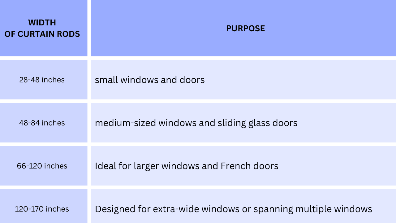 Selecting the right curtain rod is crucial in achieving a polished and harmonious window treatment. Different window and door sizes call for varying rod dimensions to ensure both functionality and aesthetic appeal. Here’s a guide to curtain rod width sizes and their ideal purposes: